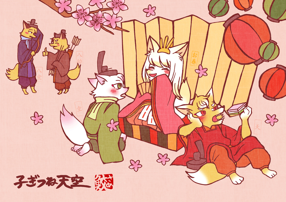 子ぎつね天空のひな祭り。お雛様の格好をしているのは、お春(はる)ちゃんという女の子。緑の着物のお内裏様が、空(くう)。菱餅を食べようとしているのが、天(てん)。後ろにいるのは、左大臣役の八助(はちすけ)と、右大臣役の八助の弟、八空(はっくう)という狐。