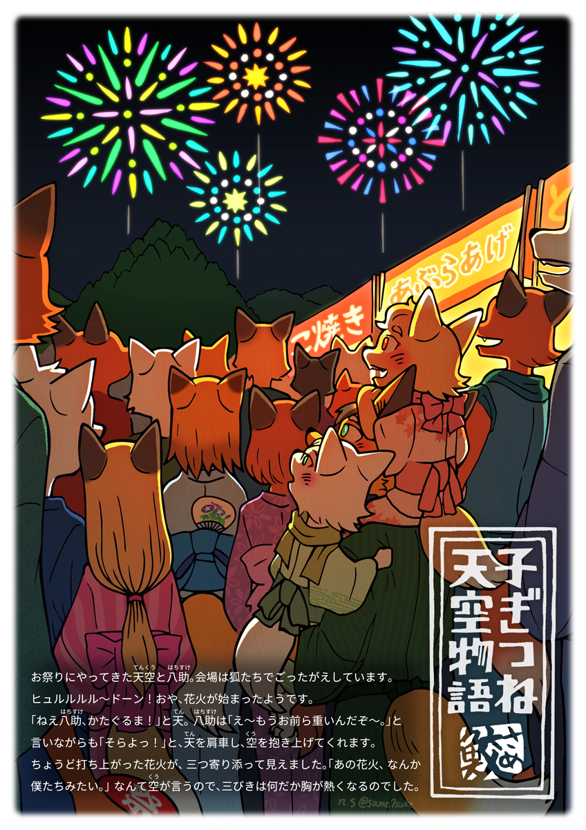 夏花火 お祭りにやってきた天空と八助。会場は狐たちでごったがえしています。 ヒュルルルル〜ドーン!おや、花火が始まったようです。 「ねえ八助、かたぐるま!」と天。 八助は「え〜もうお前ら重いんだぞ〜。」と言いながらも「そらよっ!」と、天を肩車し、空を抱き上げてくれます。ちょうど打ち上がった花火が、三つ寄り添って見えました。 「あの花火、なんか僕たちみたい。」 なんて空が言うので、三びきは何だか胸が熱くなるのでした。 samesan samesan のすべての投稿を表示